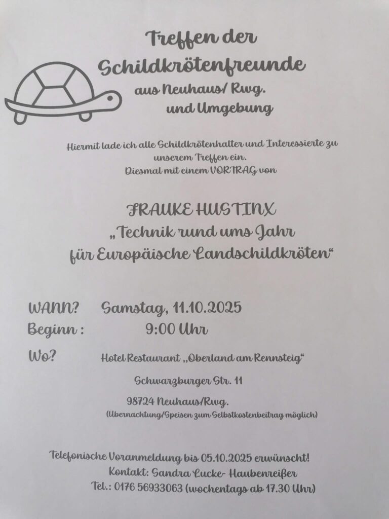 Ich freue mich sehr über die Einladung zu den Schildkrötenfreunden Neuhaus am Rennweg, am Samstag, dem 11.10. um 9:00 Uhr.