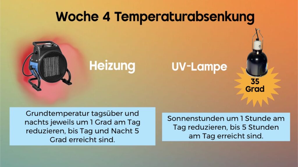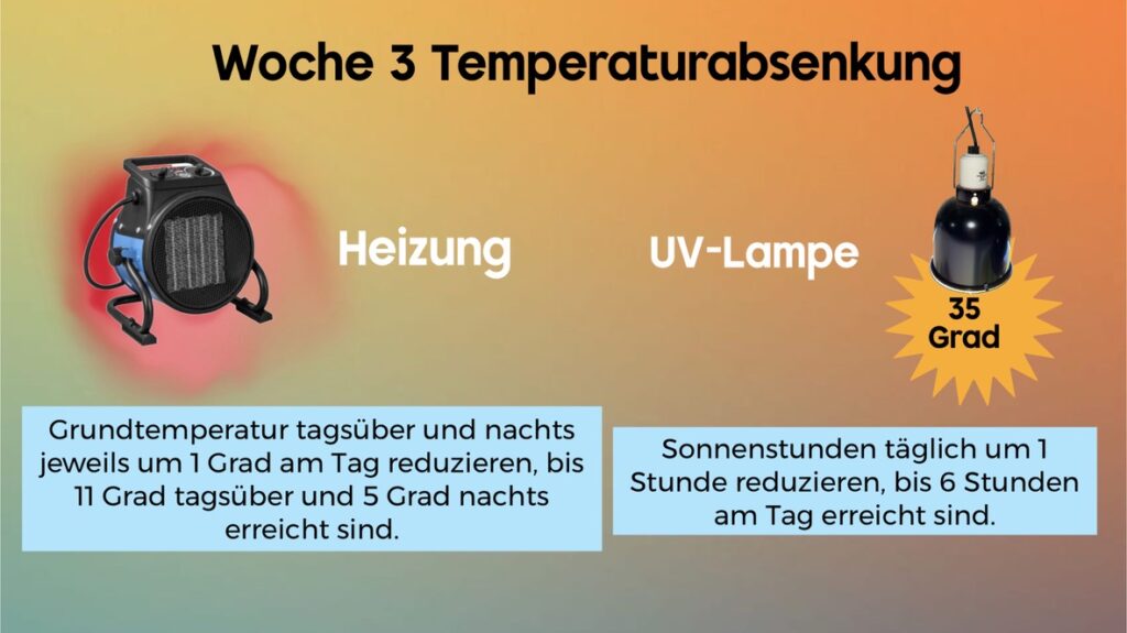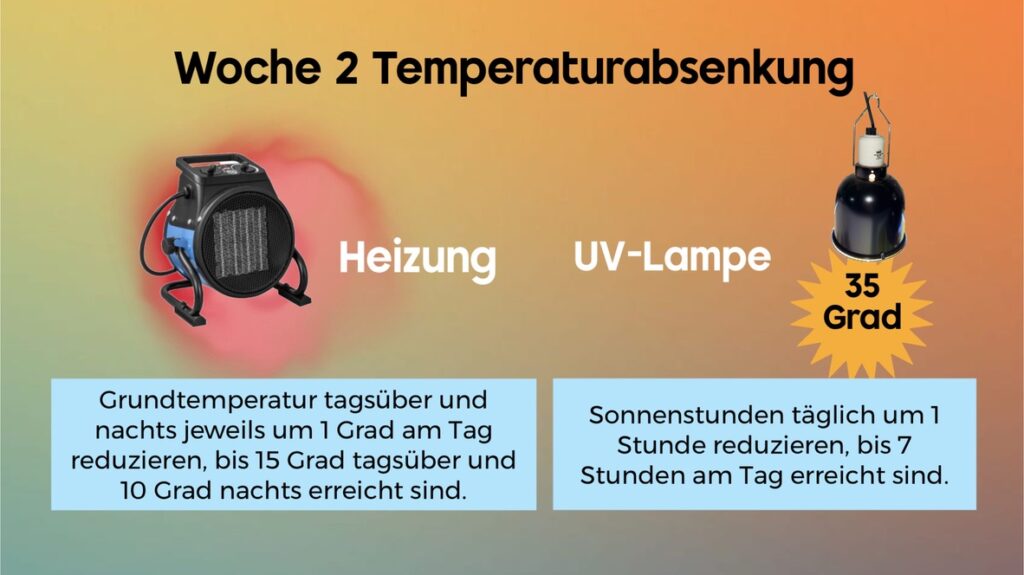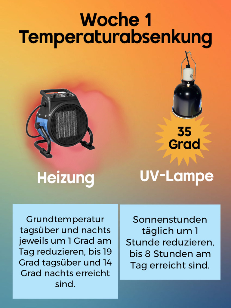 Nicht mehr als ein Grad pro Tag absenken, und die Sonnenplatzdauer nur um eine Stunde pro Tag verkürzen, damit die Tiere sich an die langsam sinkenden Temperaturen und Sonnenstunden adaptieren können.