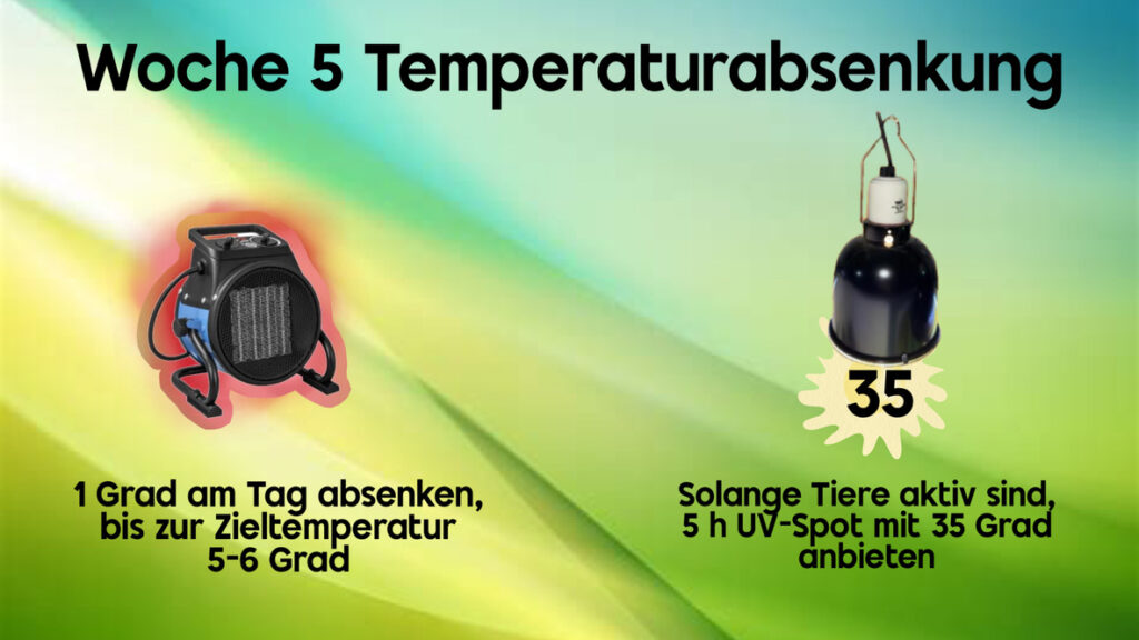 Die Umgebungstemperatur (=Grundtemperatur) auf Schildkrötenhöhe bei Griechischen Landschildkröten (am Einfachsten mittels Universalthermostat, zum Beispiel Biogreen Thermo 2 oder UT300) wird über mehrere Tage auf ca. 14 Grad in der Nacht und am Tag auf 19 Grad abgesenkt.