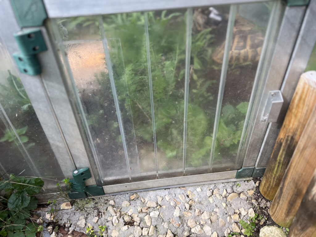 Für Schildkrötenhäuser empfiehlt sich stattdessen Acrylglas (PMMA), bekannt unter Namen wie Plexiglas oder Acrylglas. Dieses Material ist deutlich klarer, lässt mehr Licht durch und sorgt dafür, dass sich das Frühbeet besser erwärmt. Außerdem können wir unsere Tiere dadurch gut beobachten.