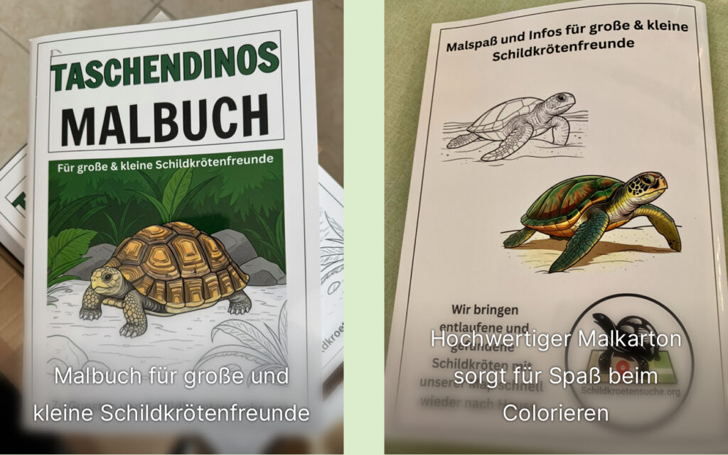 Es gibt außer dem Kinderbuch auch noch ein hochwertiges Schildkröten-Malbuch in DIN A4 mit kurzen edukativen Texten zu Land-, Wasser- und Meeresschildkröten. Auch der Erlös des Malbuchs kommt der schildkroetensuche.org zu Gute.