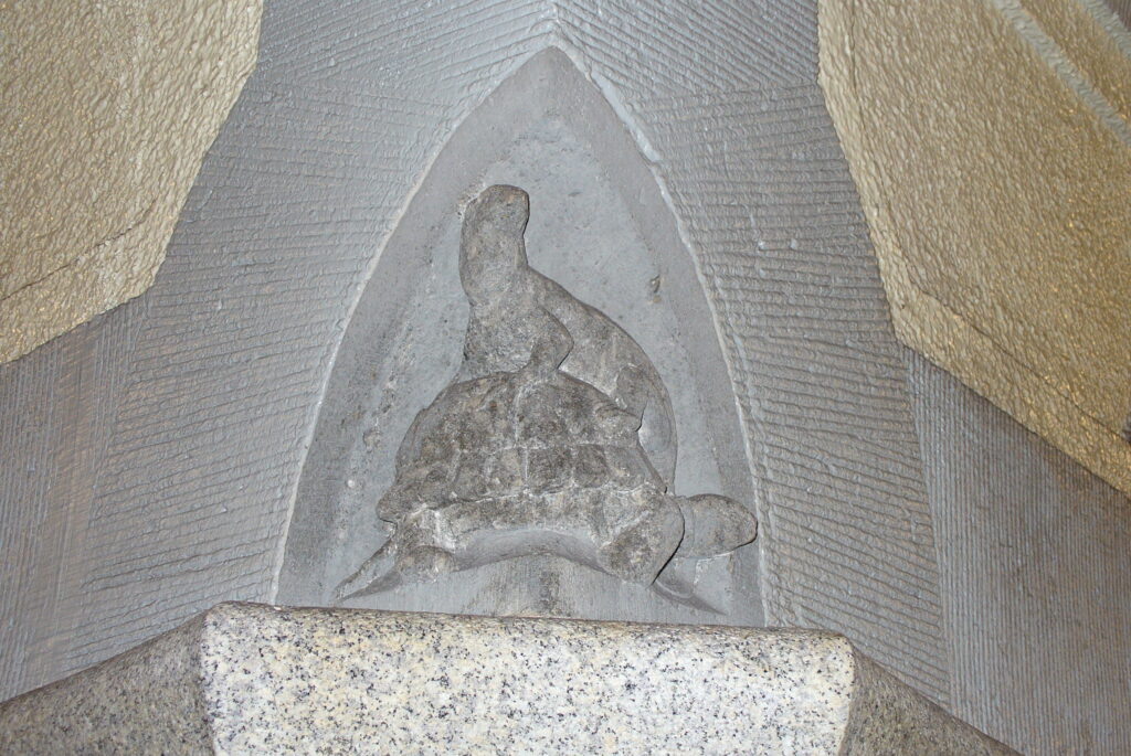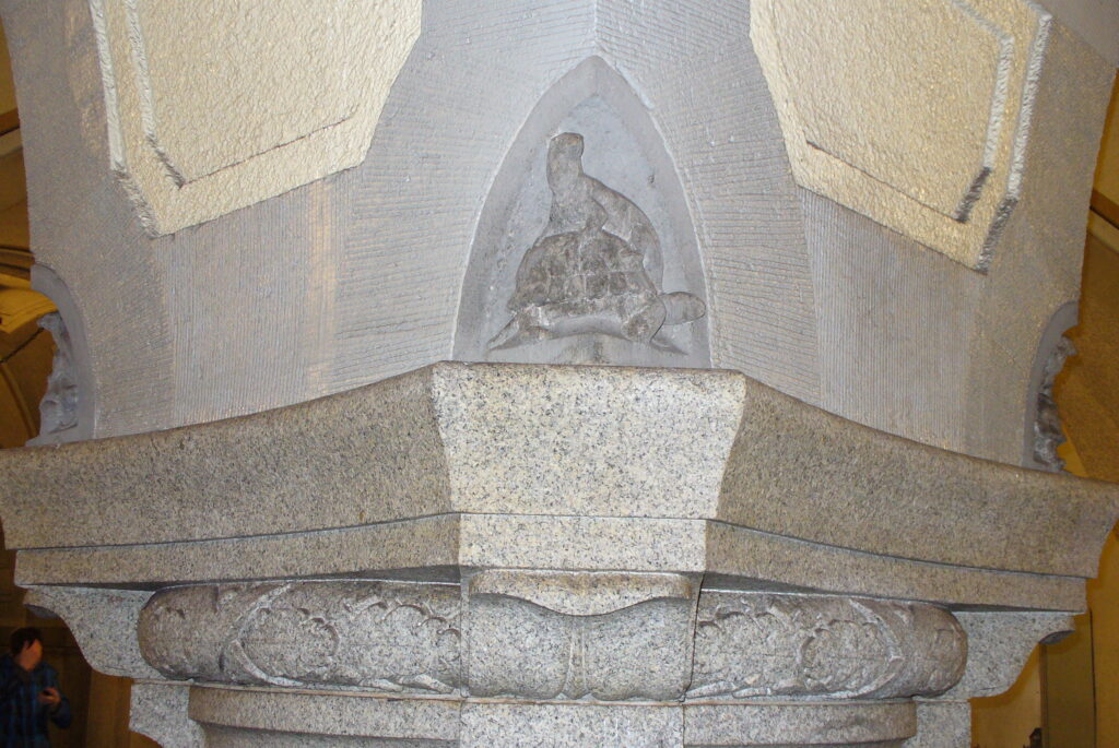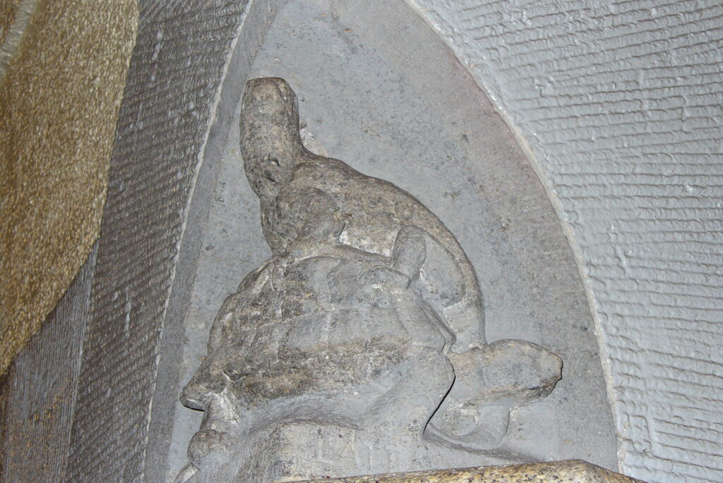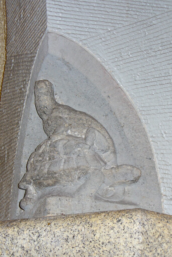 Darstellung einer Schildkröte mit einer aufsitzenden Echse an einem Stützpfeiler.