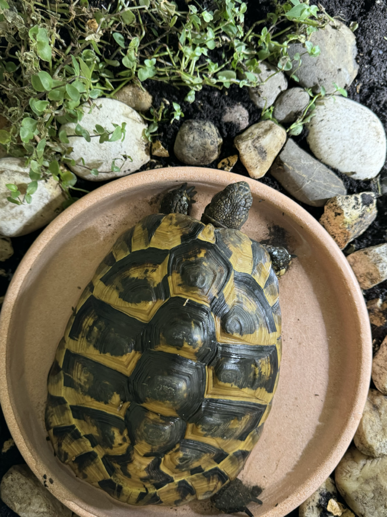 Großer Durst bei der Landschildkrötenhilfe Freiberg, Foto: Yvonne Wießner-Scholl. Unglasierte Keramikschalen sind sehr gut als Badeschalen für adulte Tiere geeignet, da sie standfest und nicht rutschig sind.