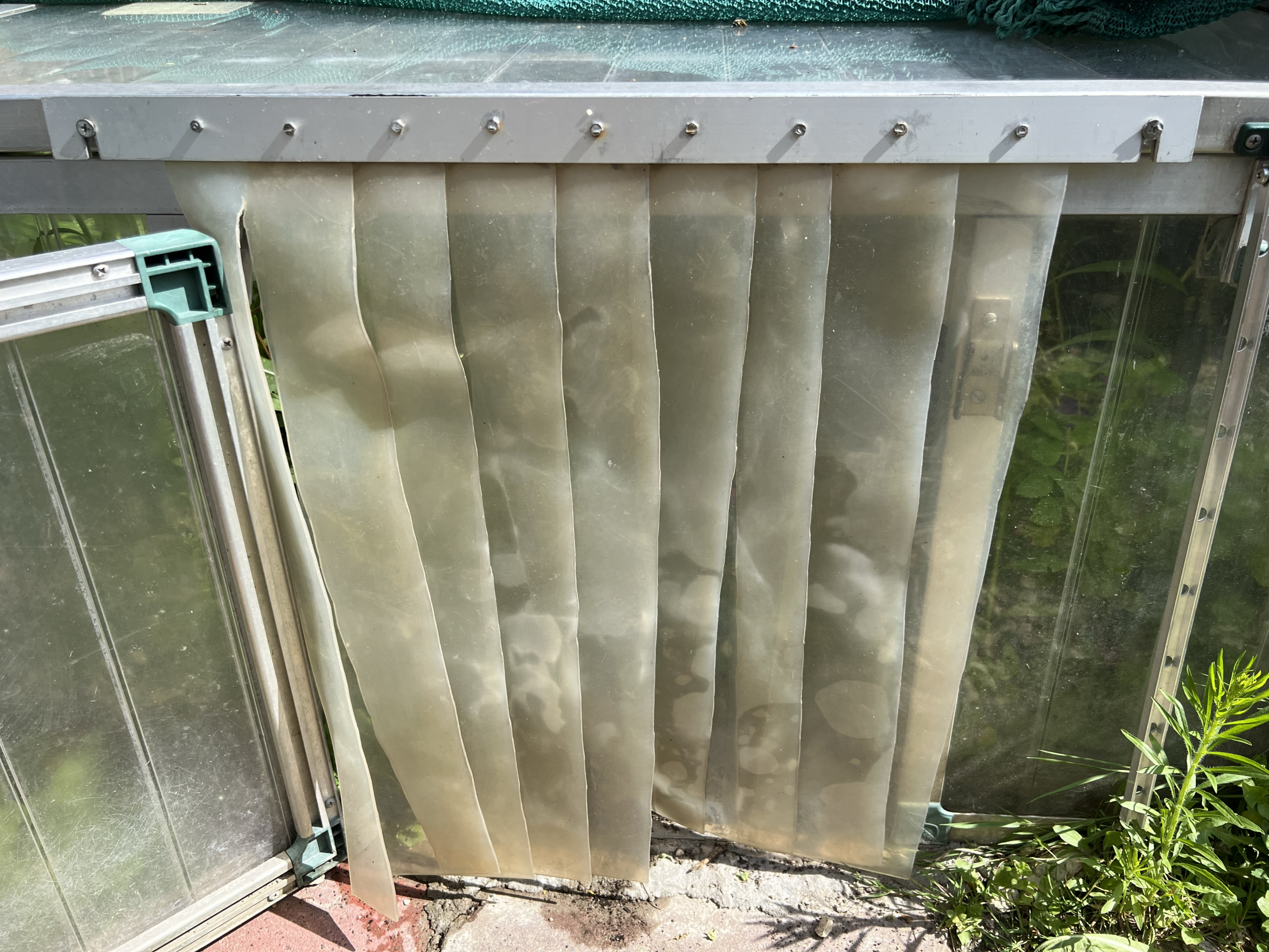 Ein Lamellenvorhang ermöglicht den Schildkröten auch bei Temperaturen unter 20°C den Ausgang ins Freigehege, ohne dass man einen nennenswerten Wärmeverlust im Frühbeet hat.