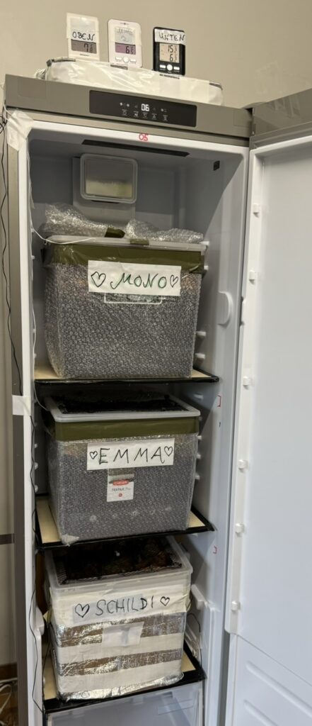 Eine kontrollierte Kühlschranküberwinterung Europäischer Landschildkröten bedeutet, dass die Tiere während der Kältestarre nicht unbeaufsichtigt bleiben, sondern durch regelmäßige, kurze Kontrollen sicher begleitet werden.