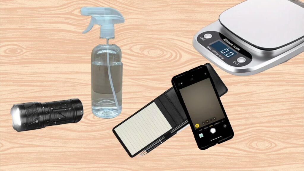 4) Waage, Notizzettel/Wiegeliste und Stift bereitlegen, Handy in den Kameramodus schalten. Die Waage auf eine glatte, feste, ebene Unterlage stellen.