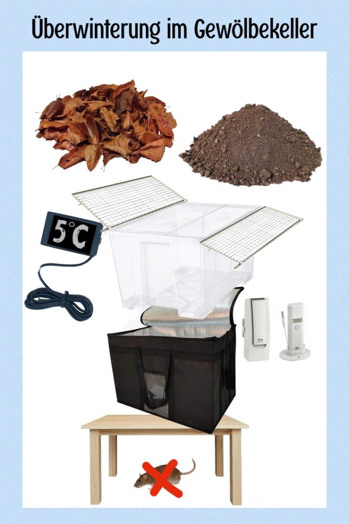 Die Temperaturüberwachung am Tier mittels Sonden ist auch bei der Überwinterung im Gewölbekeller essenziell, und sollte durch Smart-Thermometer mit Temperaturalarm erfolgen. Diese Tiere werden genauso eingewintert, wie in den Kühlschrank, nämlich fest starrend. Sie werden auch regelmäßig kontrolliert, wie Tiere in Kühlschrank-Starre, und ebenso wieder fest starrend im März im vorbereiteten Frühbeet ausgewintert.