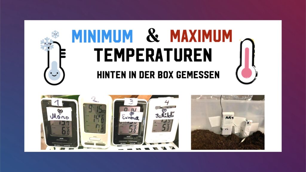 Hinten in jede Box (oder zumindest 1 x pro Ebene) kommt ein Sondenthermometer mit Minimum/Maximumfunktion. 1x am Tag sollte man die Werte notieren und zurück setzen. Es ist hilfreich, einen kleinen Post-it an jedem Sondenthermometer anzubringen, wo der Standort des Sensors angegeben ist (z.B. oben, mitte, unten…).So sieht man auf einen Blick die Temperaturen auf den einzelnen Ebenen. Wer Sensoren von Funkthermometer oder WeatherHub Sensoren hat, klebt sie mit Outdoor Panzerband innen in die Boxen im Laubbereich/ ganz leicht in die Erde gesteckt.