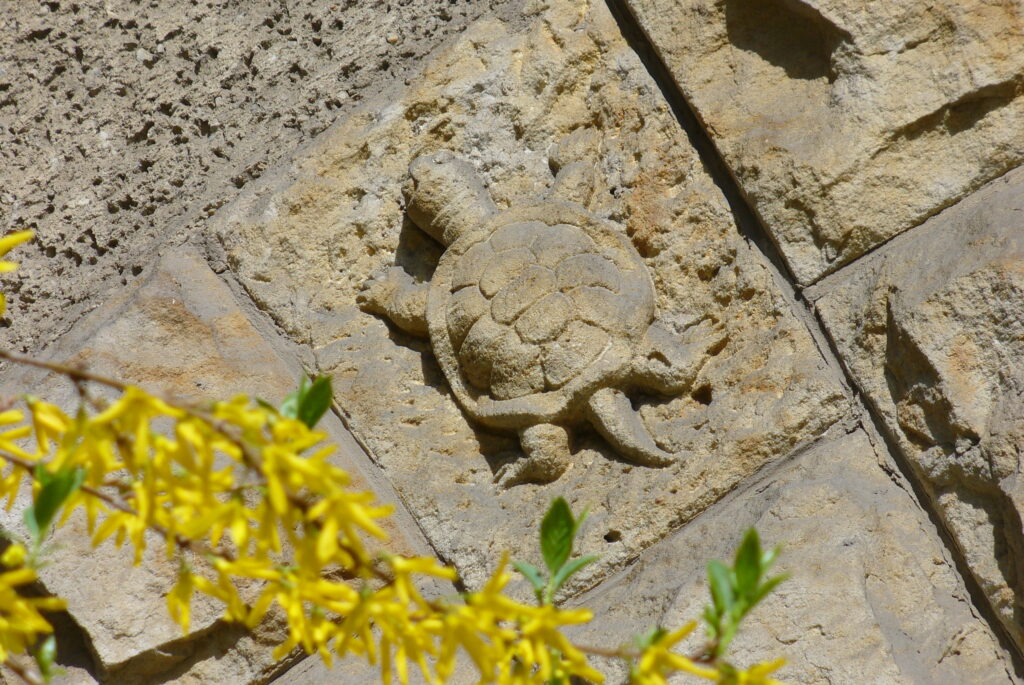 In der Mitte über der Tür thront eine Eule und links daneben, ein paar Quader weiter, befindet sich unsere Schildkröte!