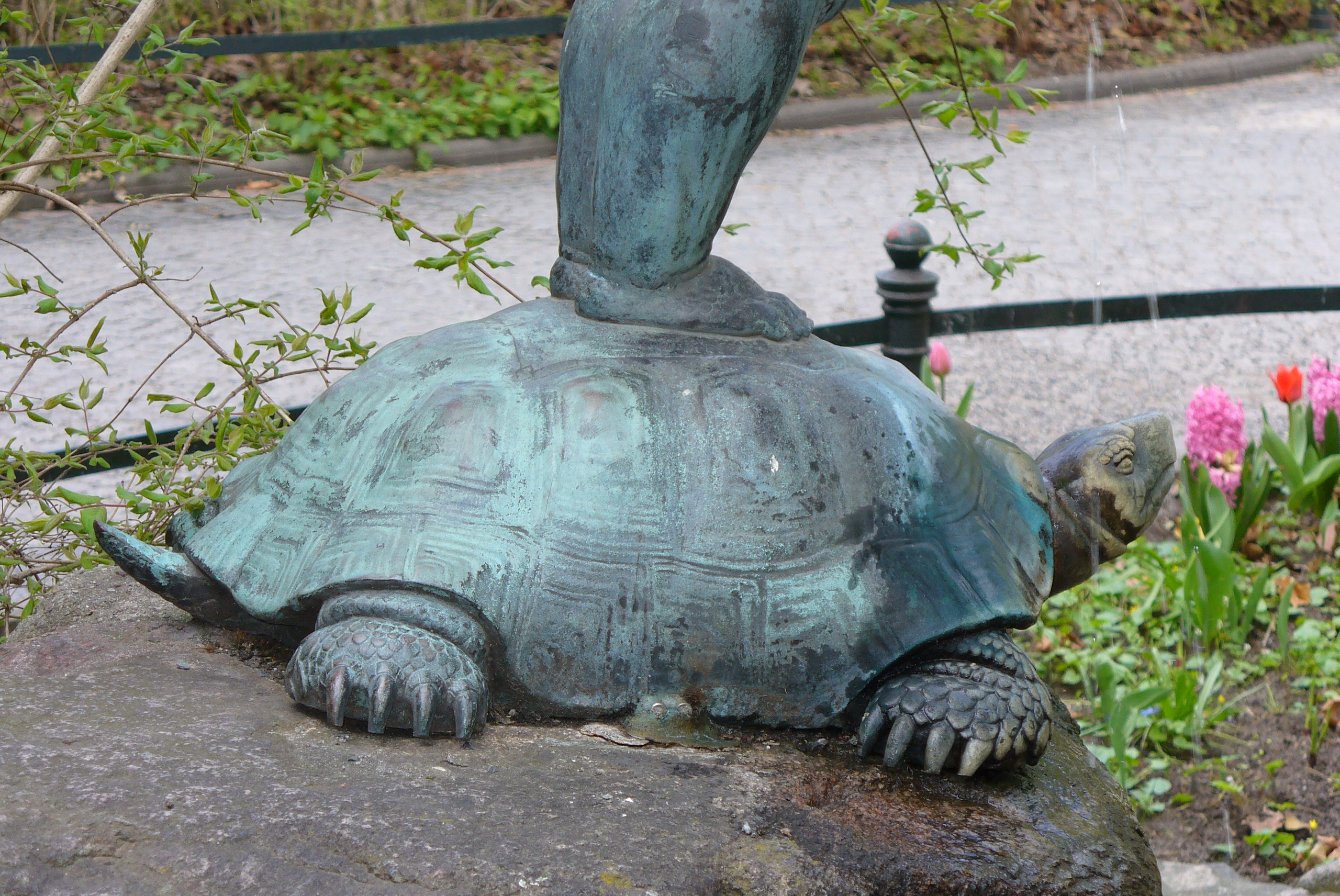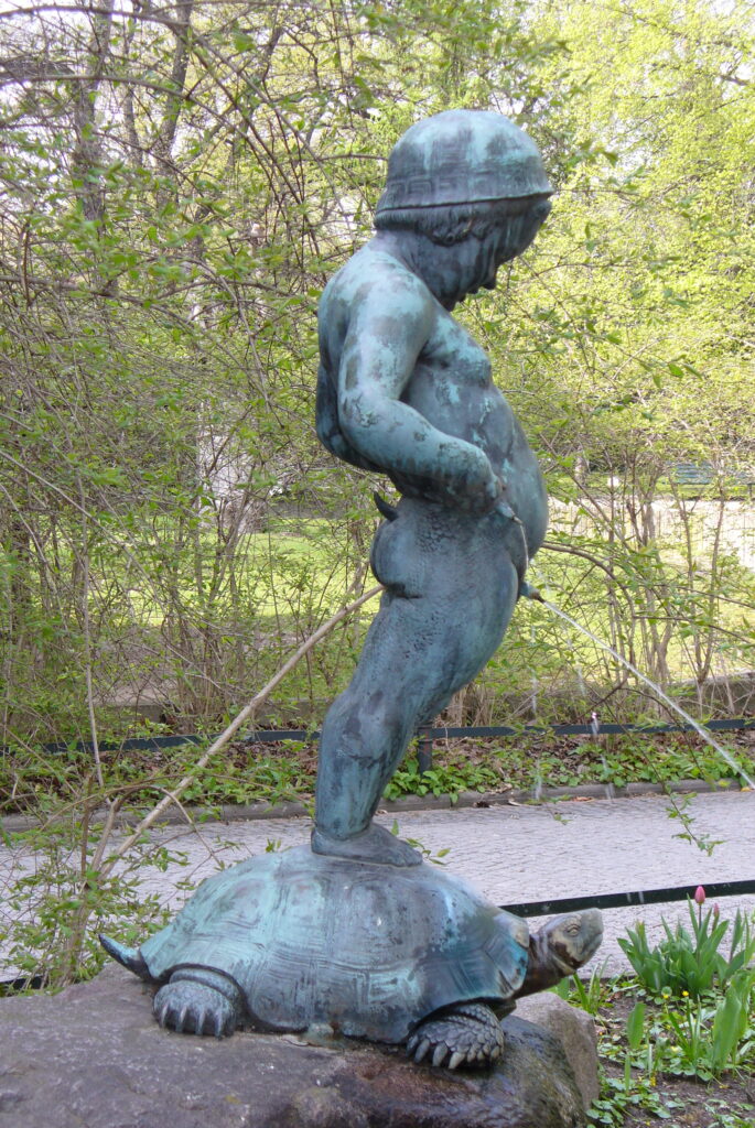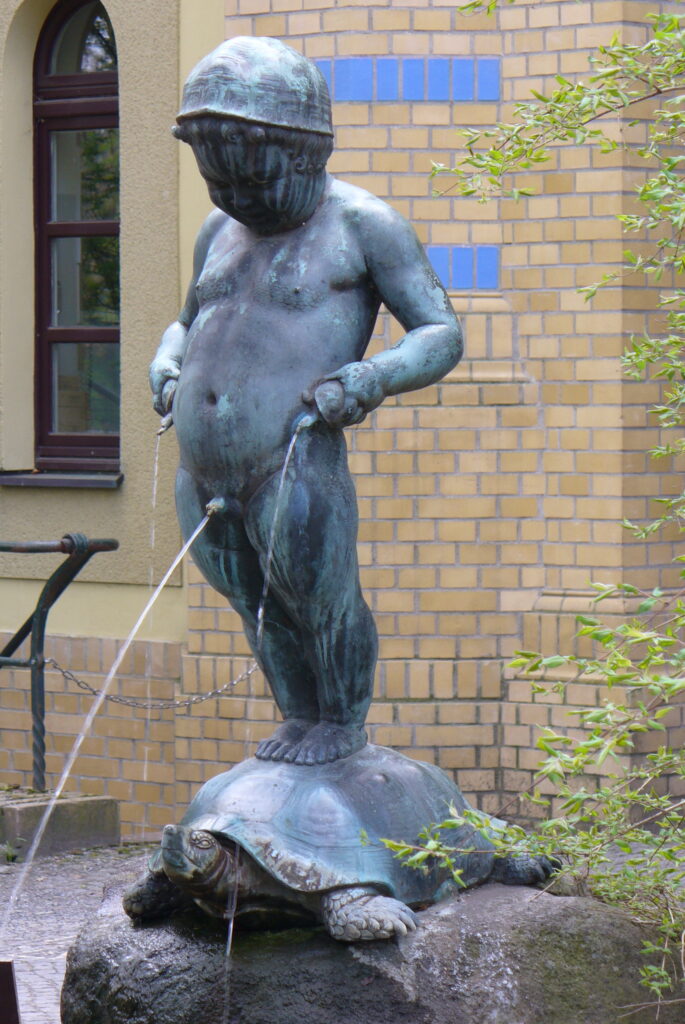 Vielleicht haben Sie ihn dort schon mal gesehen, den „Schildkrötenjungen“, den deutschen „Mannekin Pis“ oder einfach den „Krötenbub“ – ein Junge, der auf einer großen Landschildkröte steht und uriniert. In den Händen hält er jeweils eine kleine, stilisierte Schildkröte, die Wasser speit.