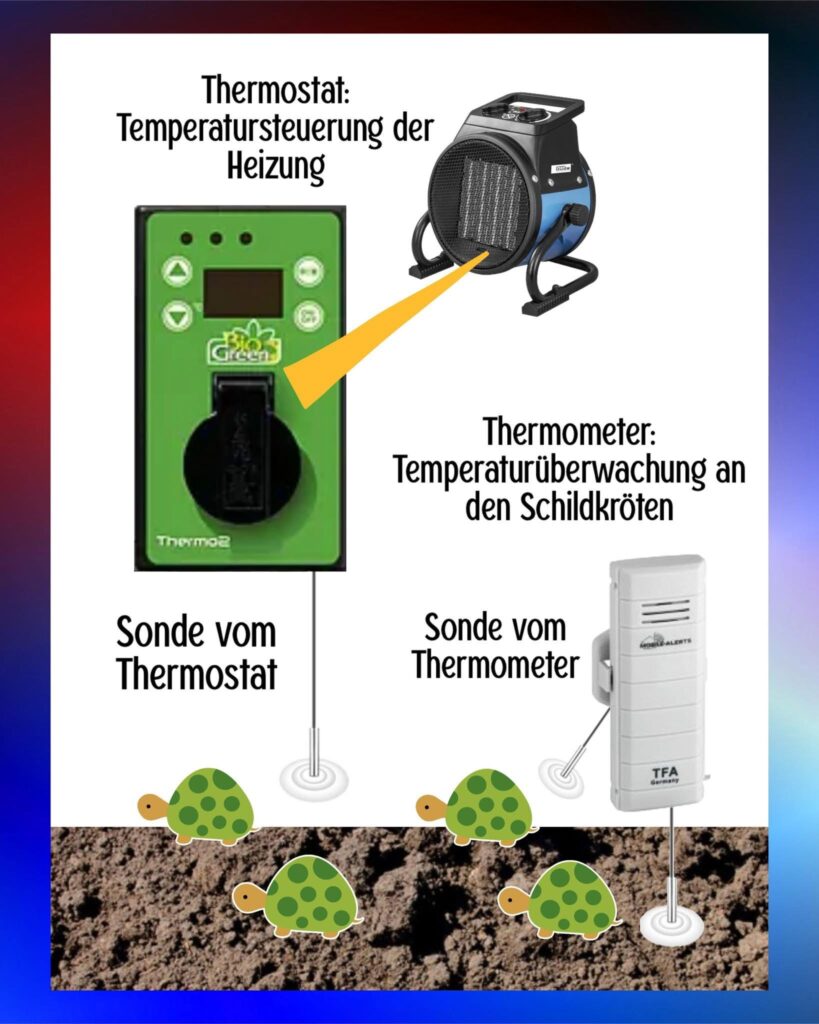 Die Sonden von Thermostaten bleiben beim Temperaturmanagement im Frühbeet stets in der Luft auf Schildkrötenhöhe, das heißt knapp über dem Substrat, während Thermometer-Sonden den Tieren beim Abtauchen während der Kältestarre ins Substrat folgen können. Zusätzlich kontrolliert man stets mit Thermometern die Grundtemperatur, gemessen in der Luft auf Schildkrötenhöhe.