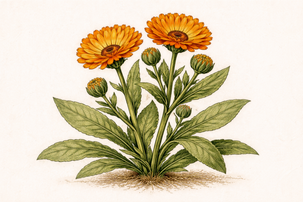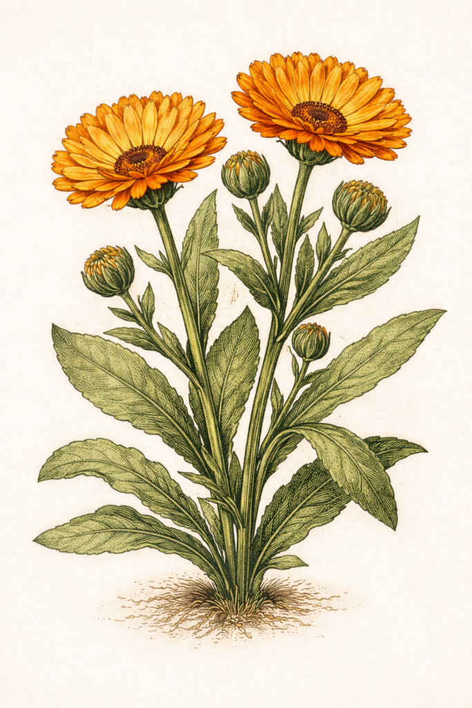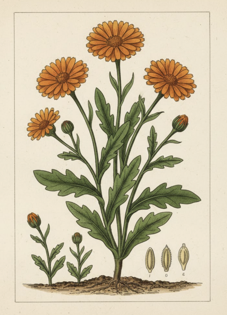 Die Ringelblume (𝘊𝘢𝘭𝘦𝘯𝘥𝘶𝘭𝘢 𝘰𝘧𝘧𝘪𝘤𝘪𝘯𝘢𝘭𝘪𝘴) ist seit dem 12. Jahrhundert als Arznei- und Kulturpflanze bekannt. Der Artname „officinalis“ verweist auf ihre Nutzung in der Heilkunde – „officina“ bezeichnete einst die Apothekerwerkstatt.