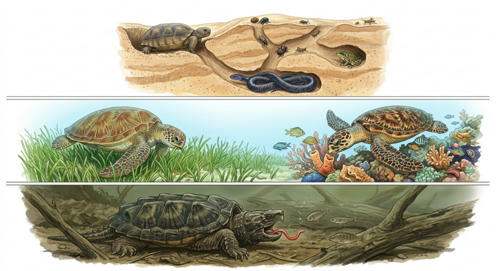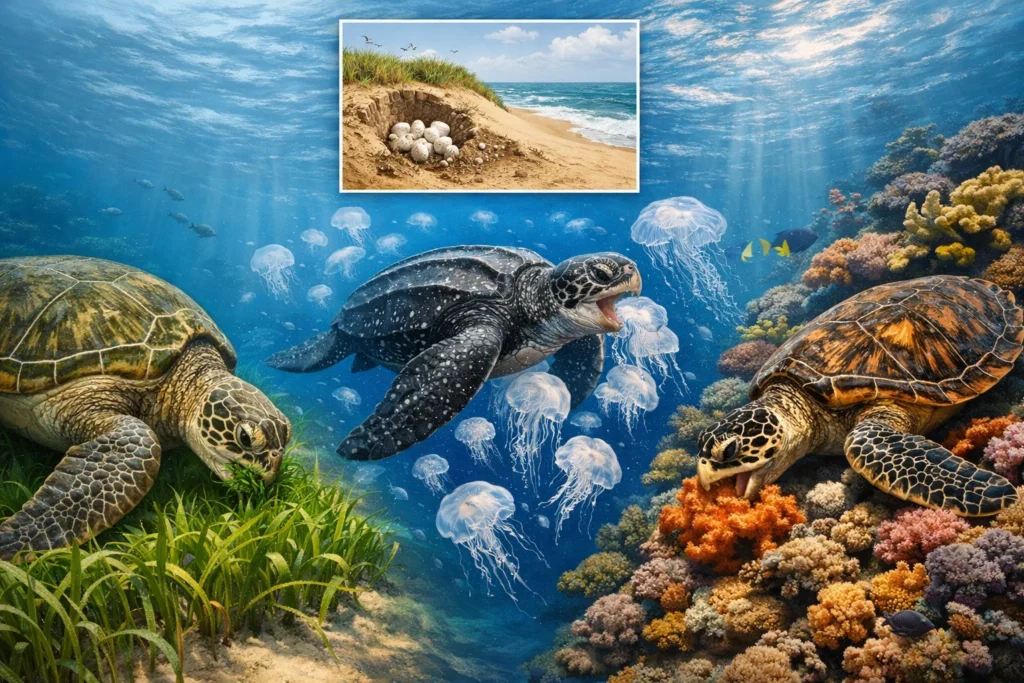 Im marinen Bereich übernehmen Meeresschildkröten entscheidende Funktionen. Die Grüne Meeresschildkröte hält Seegraswiesen durch Abweiden gesund, was diese als Kinderstube für Fische und Krebse erhält. Die Echte Karettschildkröte verhindert durch den Verzehr von Schwämmen, dass Korallenriffe überwuchert werden, und fördert so die Korallenvielfalt. Lederschildkröten wiederum regulieren Quallenpopulationen, was indirekt die Fischbestände schützt.