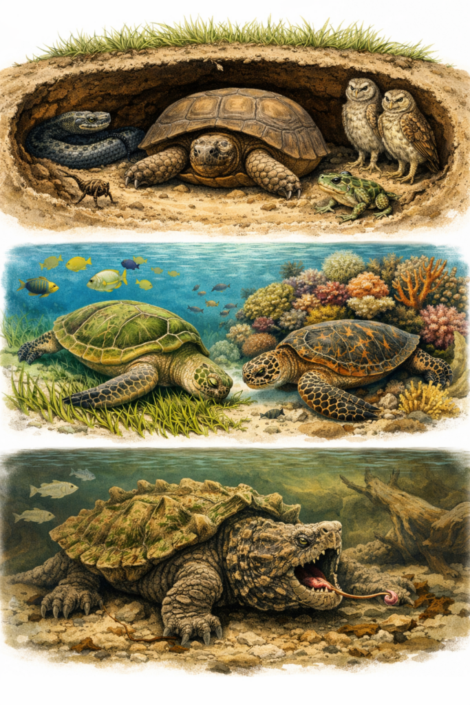 - Symbiose: Die Beziehung zwischen der Schildkröte und ihren „Untermietern“ ist ein klassisches Beispiel für Kommensalismus.