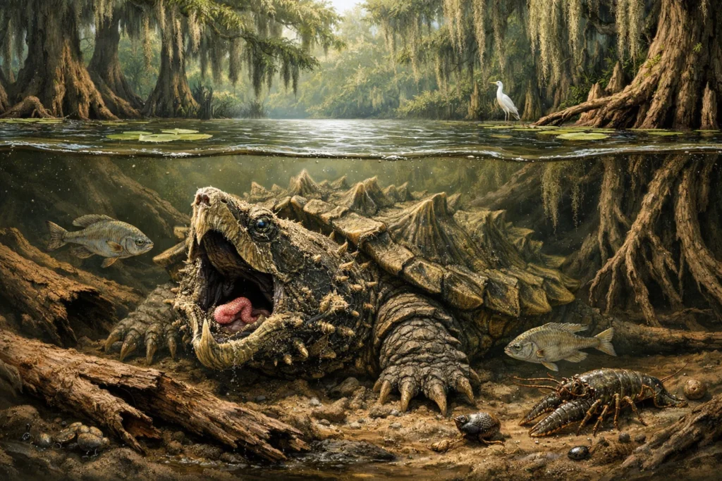 Die Alligator-Schnappschildkröte nimmt in Flüssen eine Rolle als Spitzenprädator und Aasfresser ein. Indem sie schwache Tiere erbeutet und organische Überreste beseitigt, trägt sie maßgeblich zur Wasserqualität und zum biologischen Gleichgewicht in Sumpf- und Flusslandschaften bei.