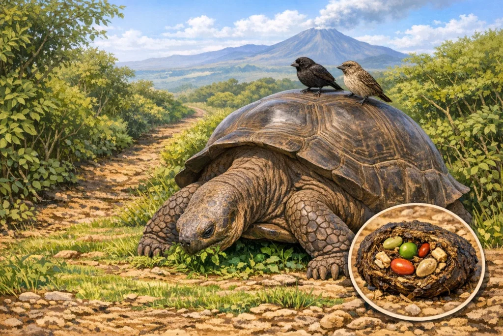 - Symbiose: Darwin-Finken fressen oft Parasiten (wie Zecken) direkt von der Haut oder dem Panzer der Schildkröten.