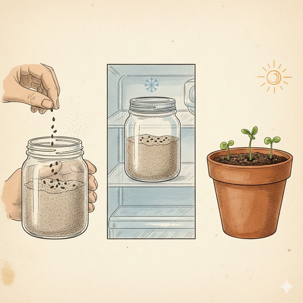 Viele Samen enthalten Keimhemmstoffe (wie Abscisinsäure), die erst durch eine längere Kälteperiode abgebaut werden müssen. In der Natur geschieht dies im Boden während des Winters. Bei der künstlichen Stratifikation ahmen wir diesen Prozess nach: