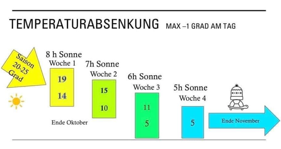 Gleichzeitig wird die Sonnenplatzdauer täglich um eine Stunde verkürzt, bis man bei 8 Sonnenstunden am Tag angekommen ist. Es ist wichtig, dabei langsam vorzugehen, damit sich die Tiere an den Rückgang der Temperaturen und Sonnenstunden gewöhnen, und noch genügend Zeit haben, zu sonnen, um noch Kot und Urat absetzen zu können.
