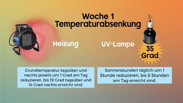 Zunächst nur die Nachttemperatur auf etwa 14 °C absenken, während die Sonnenlampe weiterhin von 9 – 17 Uhr täglich für 35 °C auf Panzerhöhe sorgt.