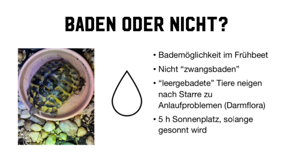Schildkröten in artgerechter Haltung sollten nur auf tierärztliche Anweisung gebadet werden. Siehe auch in Überholte Haltungspraktiken.