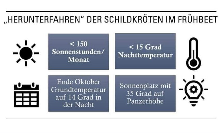Mindestens fünf Stunden Wärme am Tag sind entscheidend, solange die Tiere noch aktiv sind. Erst wenn alle Schildkröten mehrere Tage lang abgetaucht sind, darf die Sonnenlampe am Ende der Vorbereitungszeit vollständig ausgeschaltet werden.