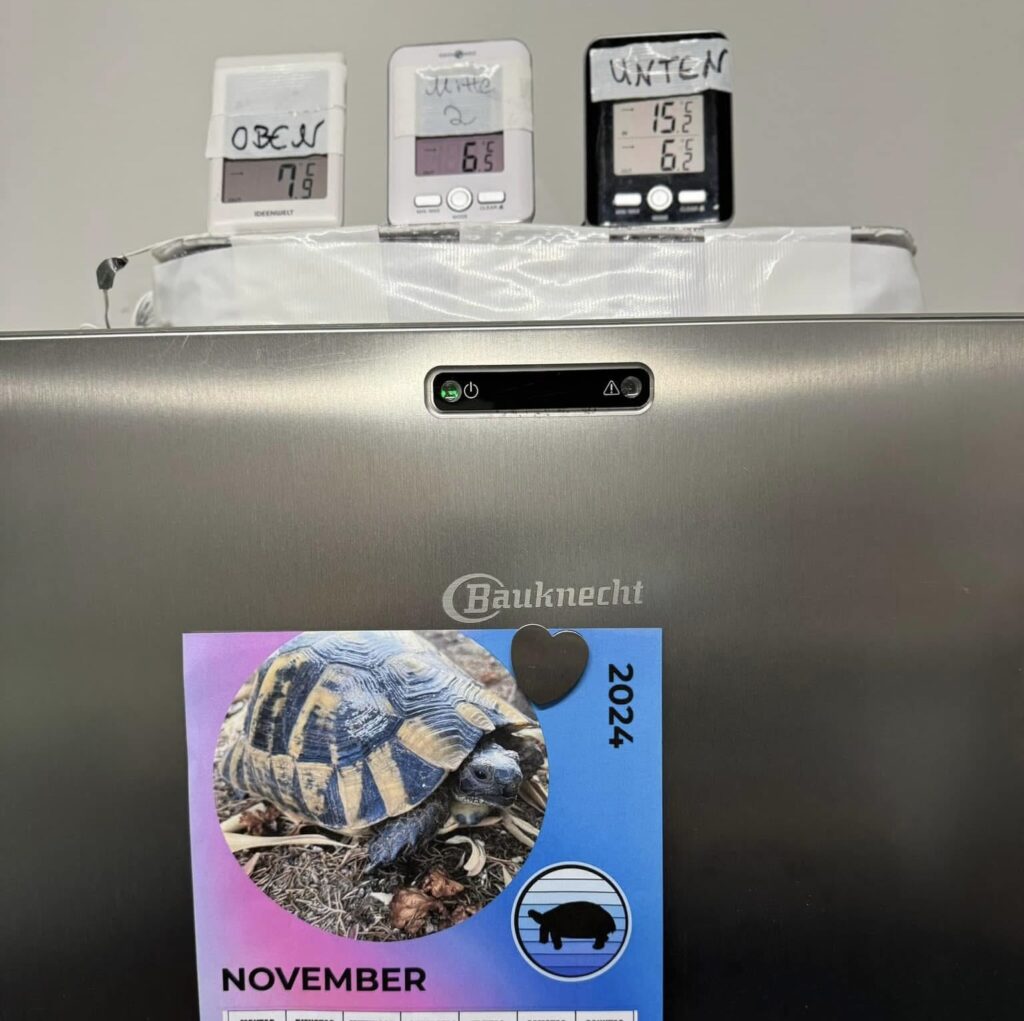 Wichtig: Die Thermometer Sonden befinden sich unterm Laub hinten in der Box leicht im Substrat, normale Thermometer unterm Laub nahe des Substrats oder auf dem Substrat. In Richtung der Kühlschrankrückwand ist es am kältesten im Kühlschrank, daher sollte die Box dort niemals anstoßen.