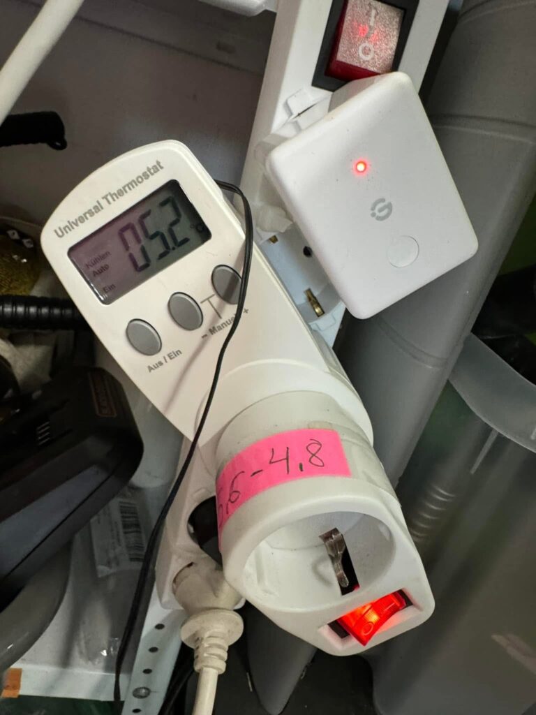 ➡️ Nur noch 5 °C Mindesttemperatur am Tag und in der Nacht absichern. Nun muss man probieren, die Temperaturen mittels Thermostat zwischen 5 und 6 °C zu halten. Ein separater Temperaturalarm ist dringend zu empfehlen.