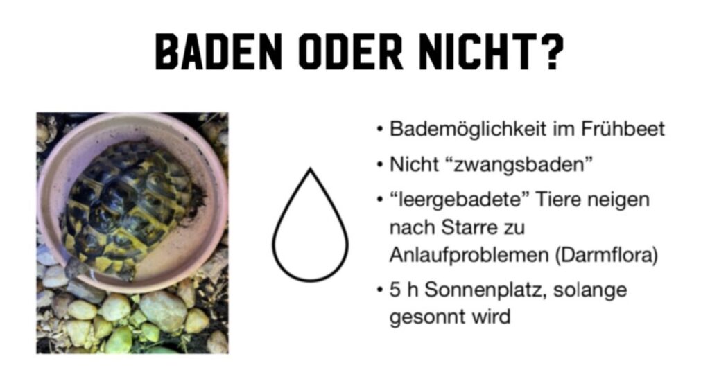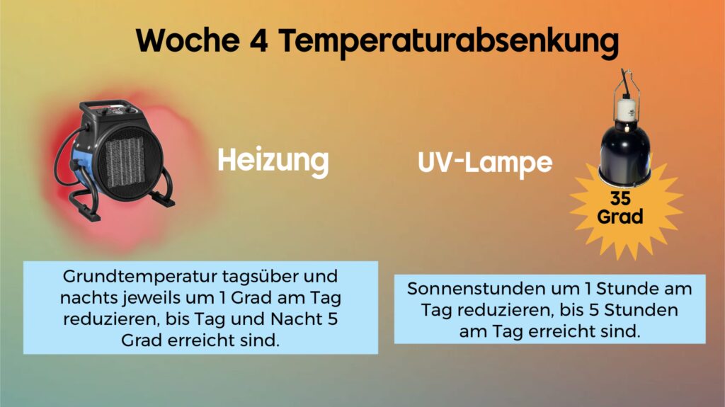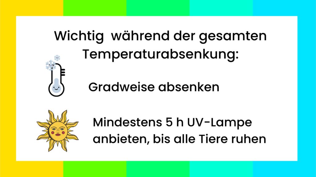 Sind noch Tiere aktiv, bieten wir mindestens 5 Stunden Sonnenlicht pro Tag, bis alle vollständig 1 Woche lang abgetaucht beziehungsweise wirklich inaktiv sind. Es empfiehlt sich, mindestens bis Ende dieser 4. Vorbereitungswoche den UV-Spot noch anzubieten, bei Bedarf natürlich auch länger. Futter und Wasser werden stets zur freien Verfügung angeboten.