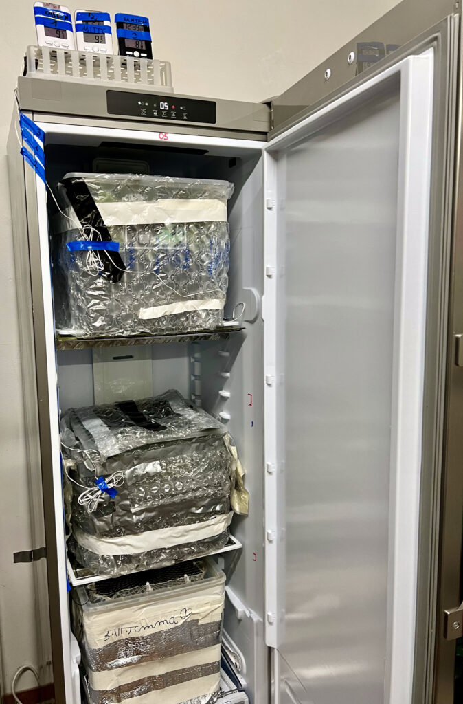 Der Kühlschrank sollte jetzt auf 4,5–7 °C eingeregelt sein – und zwar auf allen Ebenen. Durch das tägliche Ablesen der Minimum-/ Maximum-Thermometer wissen wir nun, welche Box die kälteste ist und wie die tatsächlichen Schwankungen aussehen.