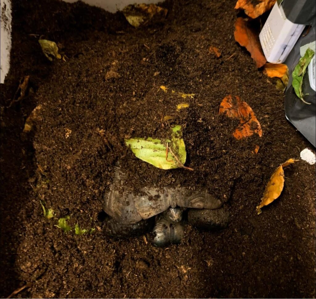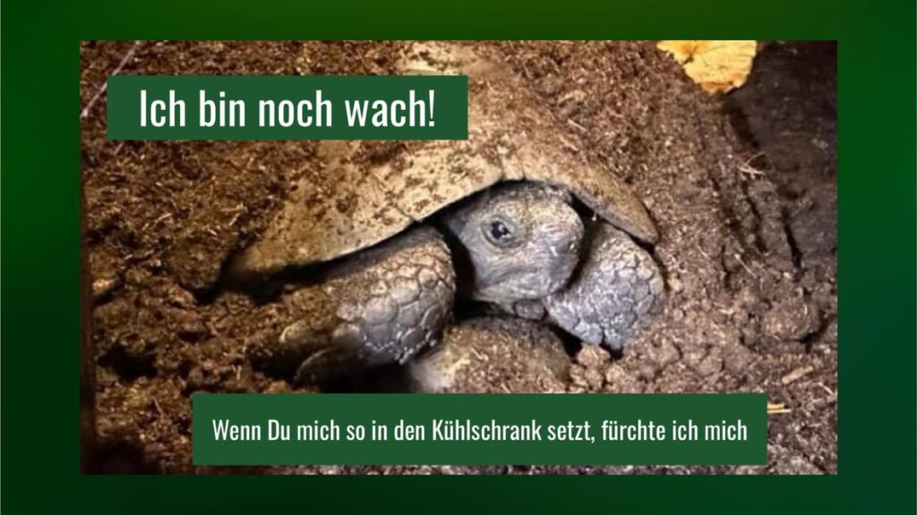 Wenn die Schildkröten 2 Wochen dauerhaft unterhalb von 8 °C im Frühbeet gestarrt haben, kann man sie fest starrend in den eingefahrenen und mittels UT300 abgesicherten Kühlschrank überführen. Wache Schildkröten werden nicht eingewintert, sondern dürfen sich weiter Im Frühbeet vorbereiten. Vor der Einwinterung steht Wiegen und ein kurzer Rundumcheck an. In der Regel ist Nikolaus ein Datum, das man ungefähr für die Überführung in den Kühlschrank anpeilen kann.